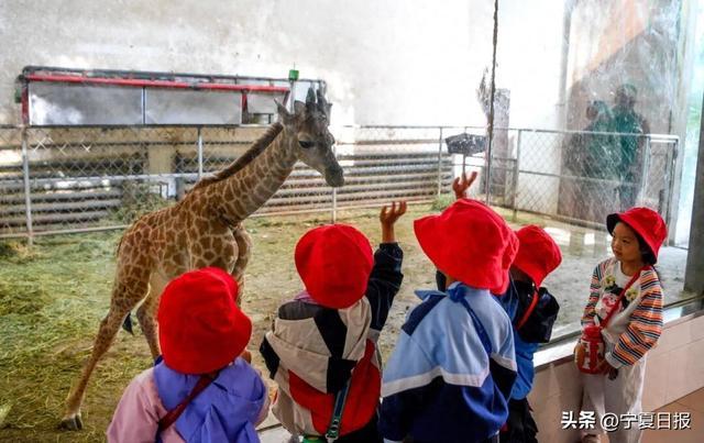10月1日清晨,第一波小观众慕名来到银川市中山公园动物园内。长颈鹿宝宝“瑞霖”先是被小朋友们鲜亮的衣着吓了一跳,闪身躲到妈妈“庆庆”的身后。很快,它便“读懂”了人们友善的表情,主动靠近人群,一会儿仰头张嘴,一会儿弯下长长的脖颈挠肚皮,它的一举一动,都令围栏外的孩子们兴奋。